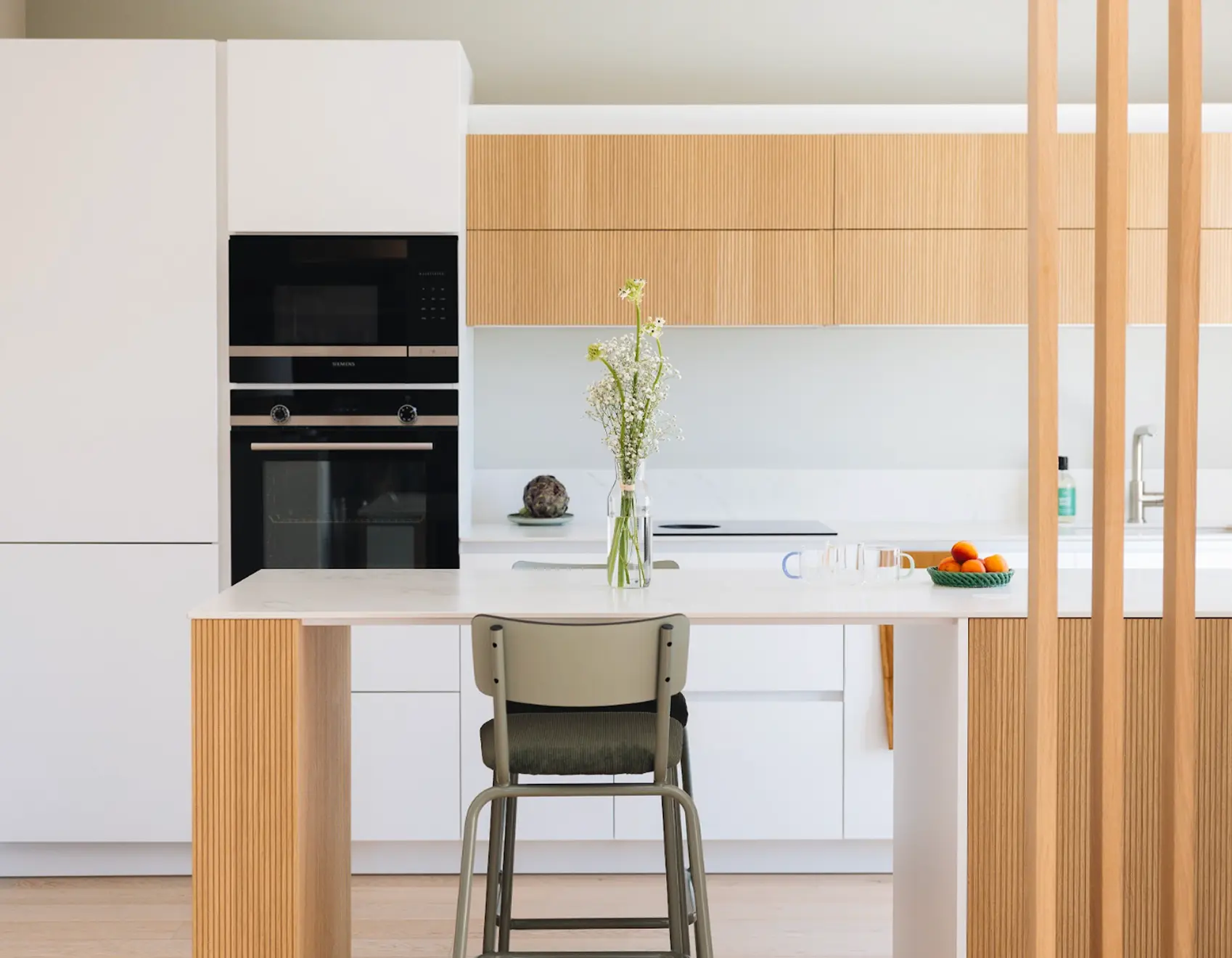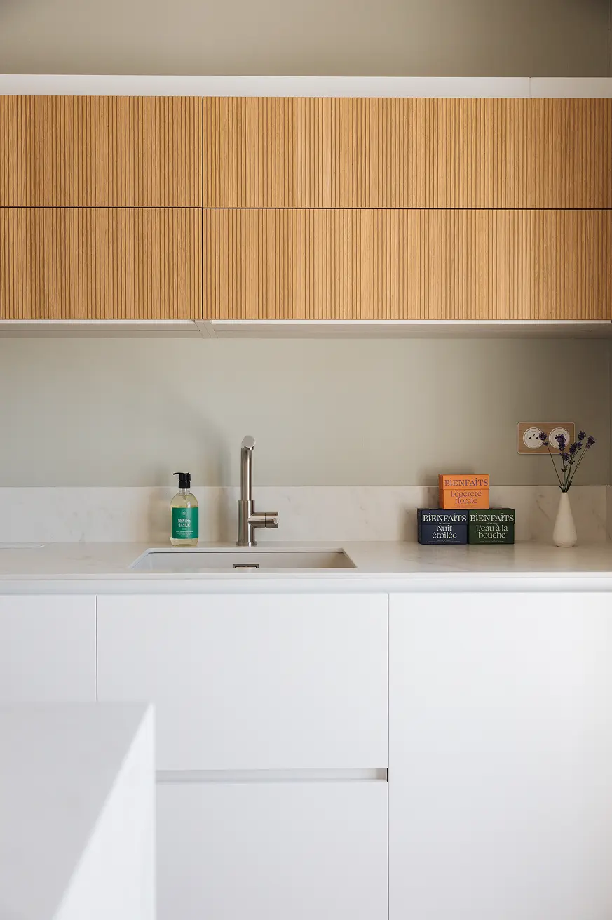 Le projet : une réalisation sur-mesure de style scandinave qui concilie l’authenticité d’un placage en chêne rainuré et la modernité d’une finition blanche ultra-matte, articulée autour d’un très bel îlot central.